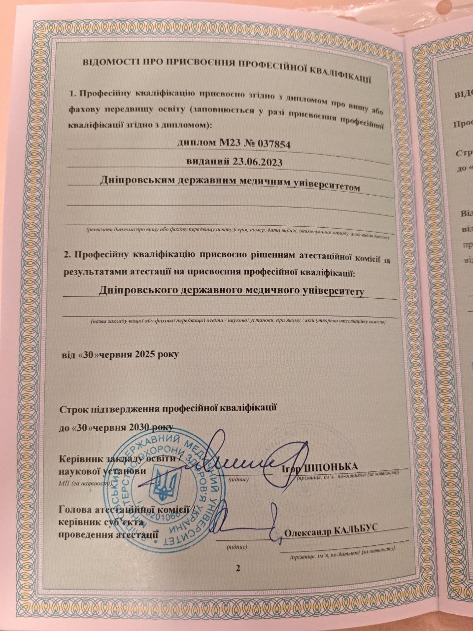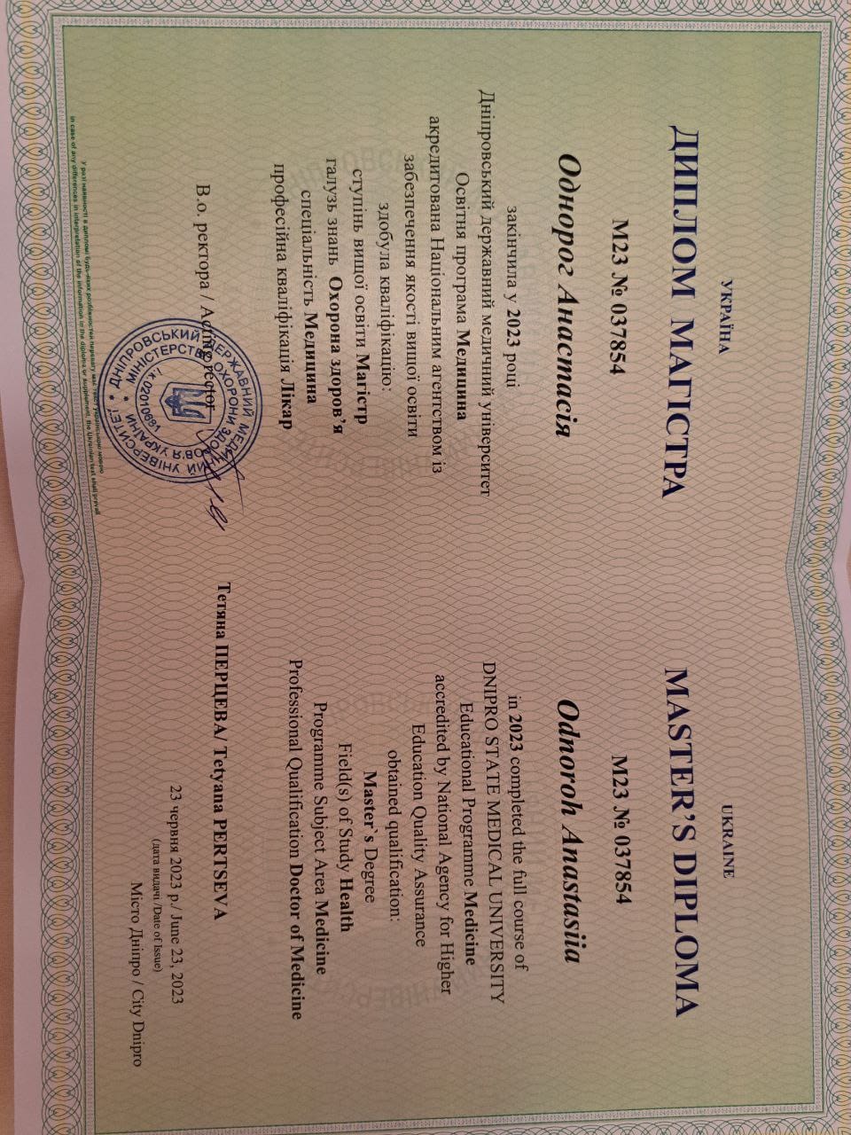 Закінчила Дніпровський державний медичний університет у 2023 році, інтернатура за спеціальністю «Неврологія» — 2025 рік. Брала участь у науково-практичній конференції з міжнародною участю «Інноваційні підходи в нейрофізіології: від м’язів до мозку», що стала платформою для обміну досвідом між провідними фахівцями галузі.