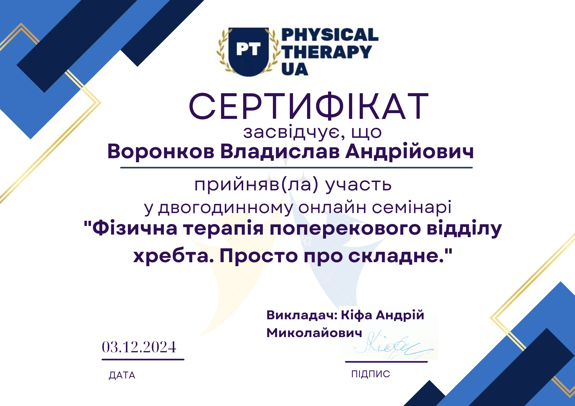 Має досвід роботи у сфері масажу та фізичної терапії, працює з пацієнтами після травм, операцій, а також з функціональними порушеннями опорно-рухового апарату.